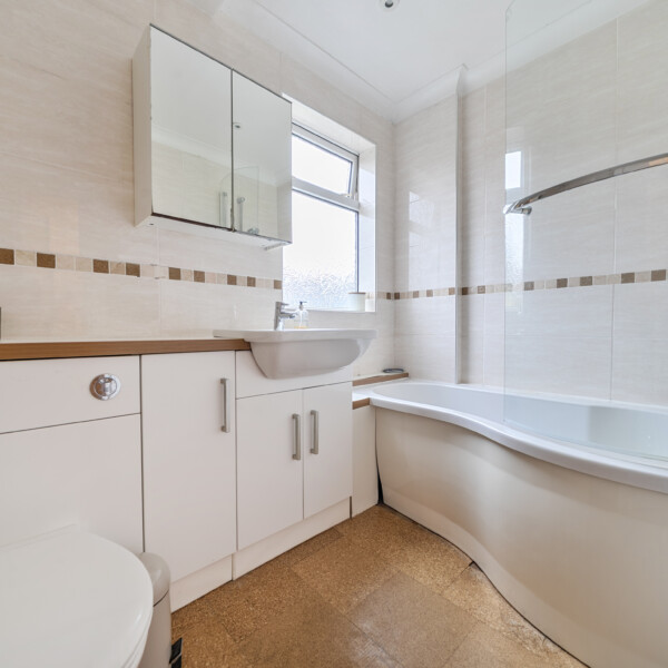The family bathroom is tastefully presented with cork-tiled flooring, tiled walls, a bath with an overhead shower, a wash basin with storage below and mirrored cabinetry above, a WC with concealed cistern, and an extractor fan.