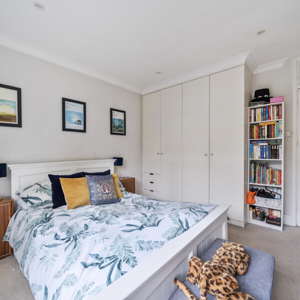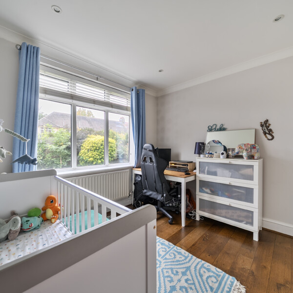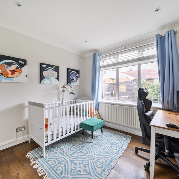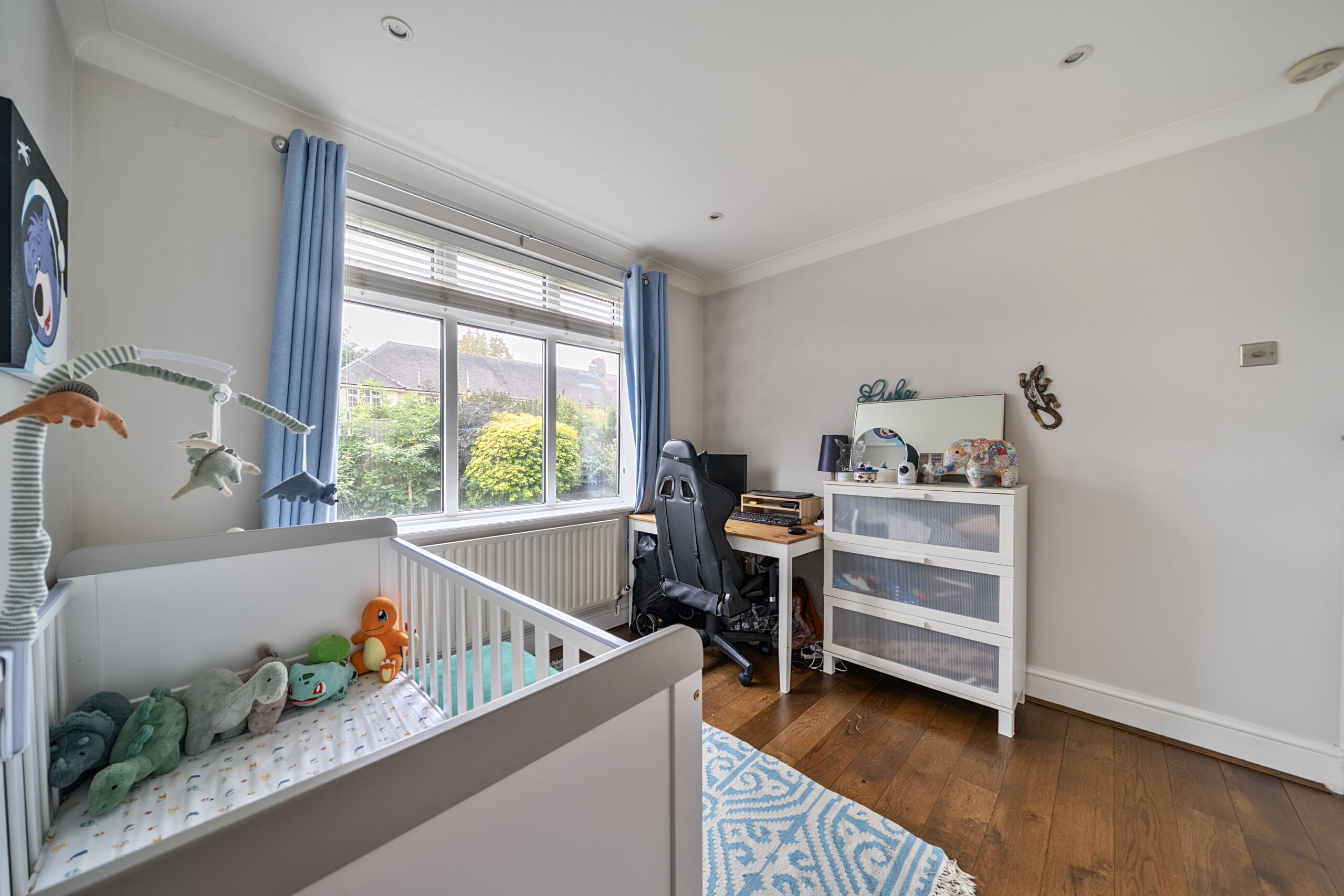 Across the hall, the second bedroom, currently used as a nursery and office, also includes a fitted wardrobe and enjoys views over the rear garden.