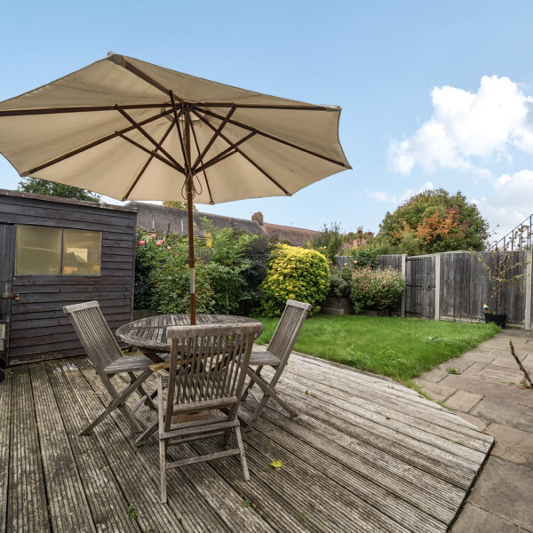 Doors open from the kitchen onto the beautiful west- and south-facing garden, which features a Yorkstone patio ideal for outdoor dining, a lawned area with mature flowerbeds, a decked section, and space for a shed. Side access leads conveniently to the front of the property.