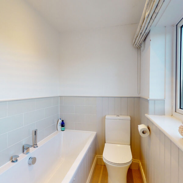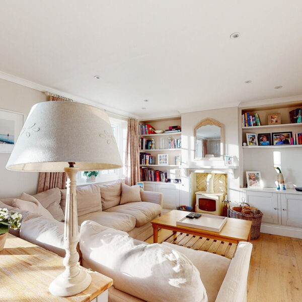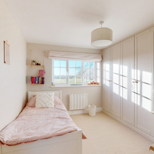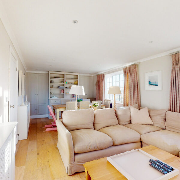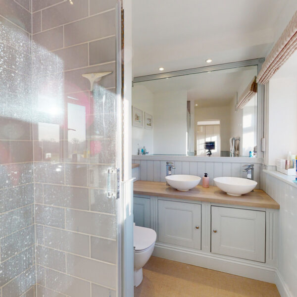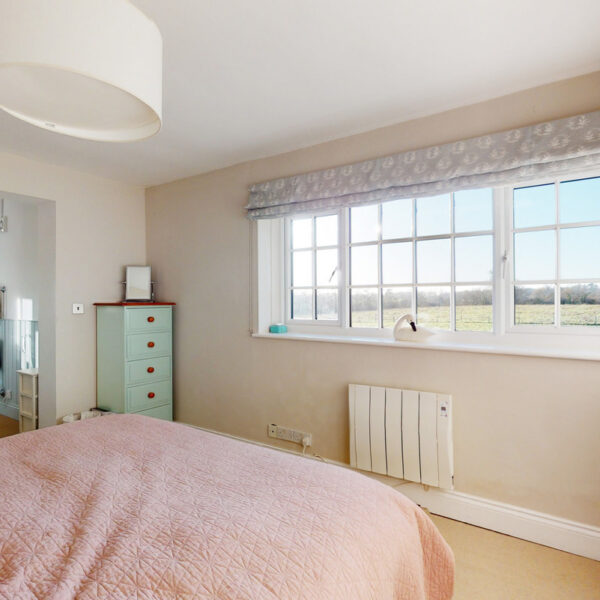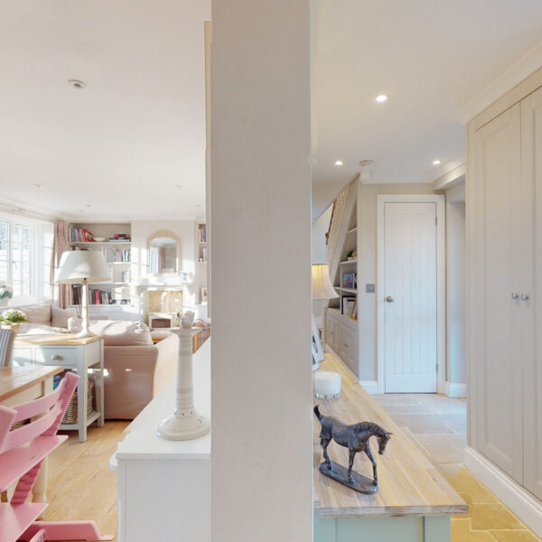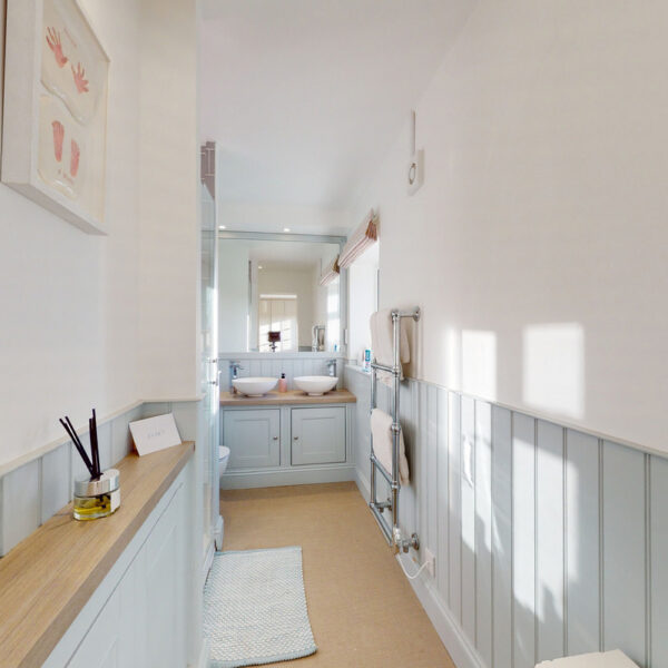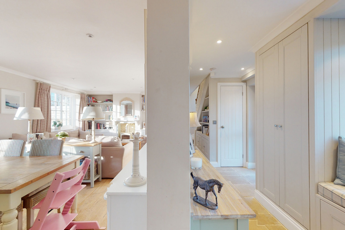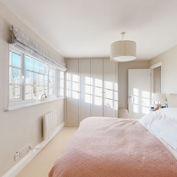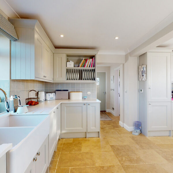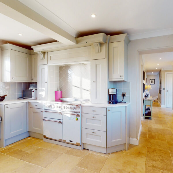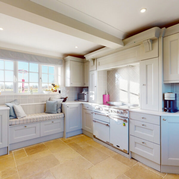 The kitchen is beautifully appointed with painted Shaker cabinetry and clever storage, including window-seat cupboards. A Corian worktop houses a double Butler’s sink, with integrated Neff appliances and a Rangemaster cooker.
