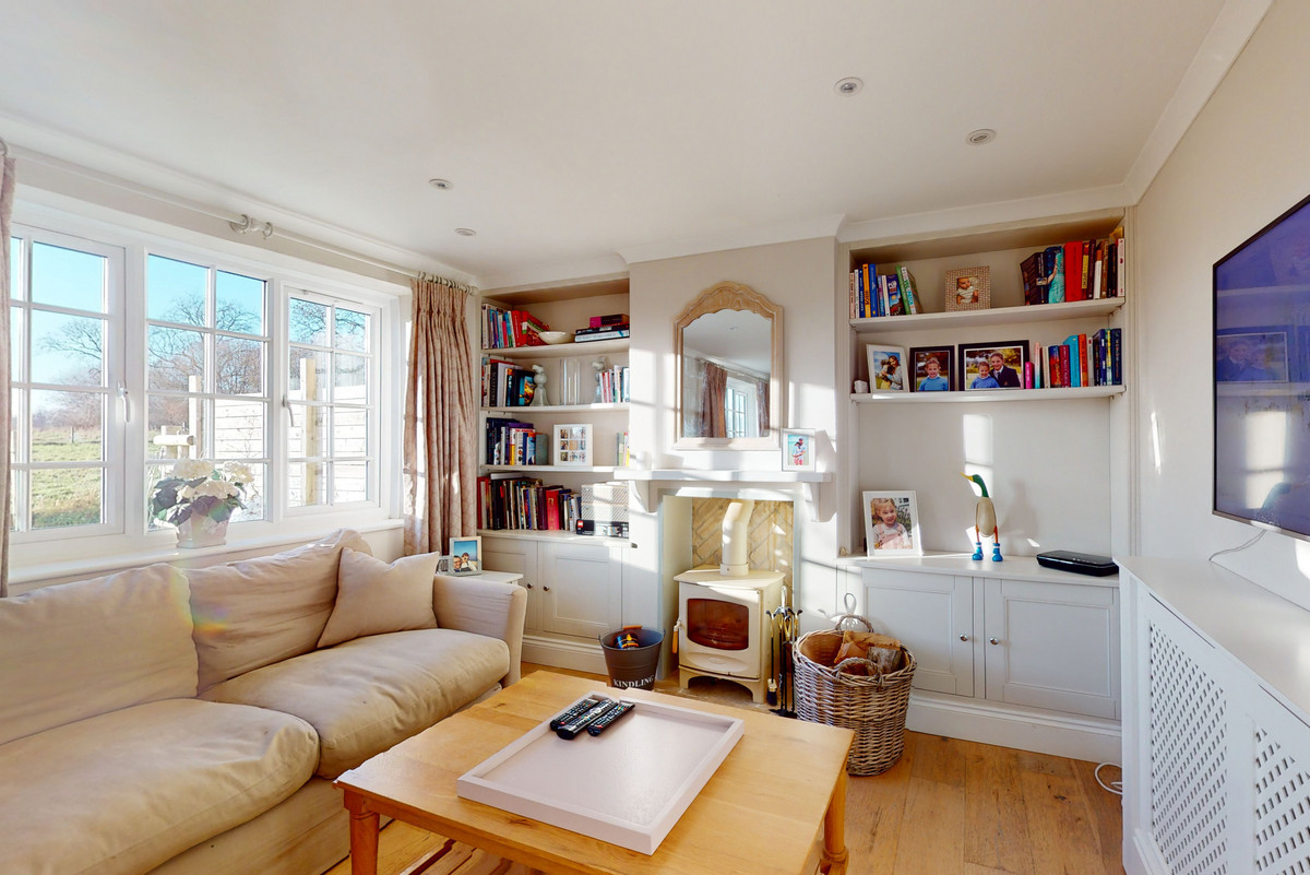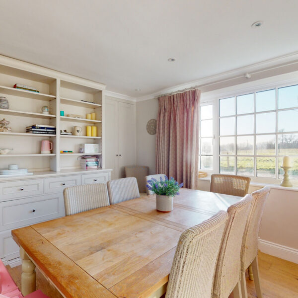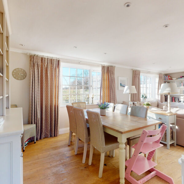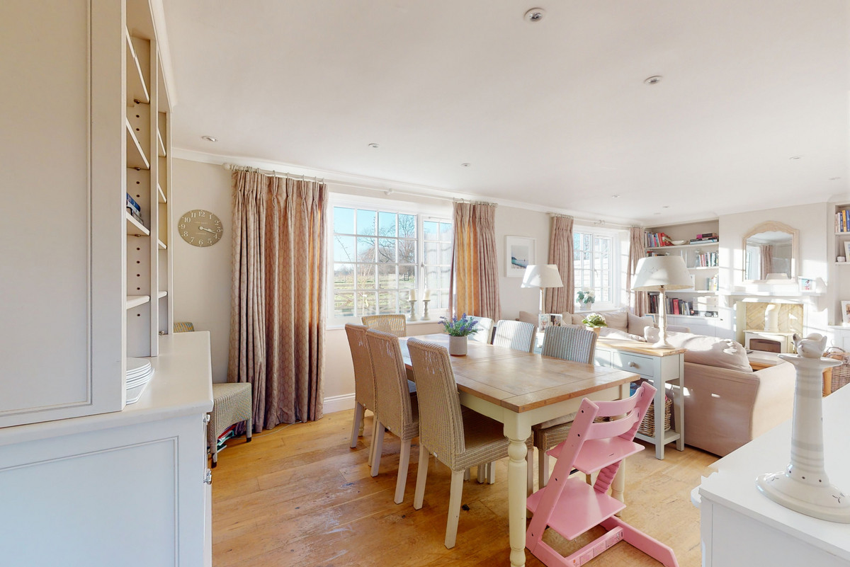 The generous reception and dining room is filled with natural light from twin windows framing open views. A log-burning stove creates a warm focal point, while the dining area easily seats eight. Lime-washed wood flooring ties the space together.