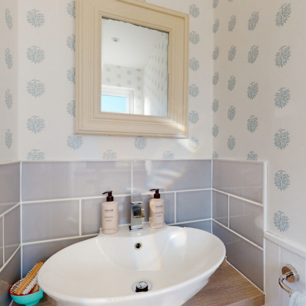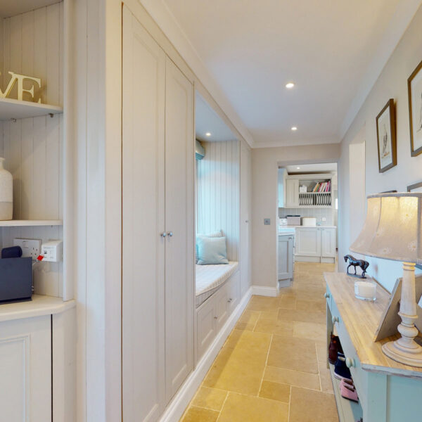 The front door opens into a welcoming hallway, laid with limestone flooring that continues through the kitchen and rear hall, both warmed by underfloor heating. Off the hall is a practical utility room, and opposite, a smart cloakroom with painted panelling.