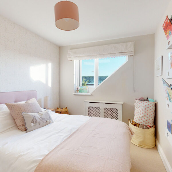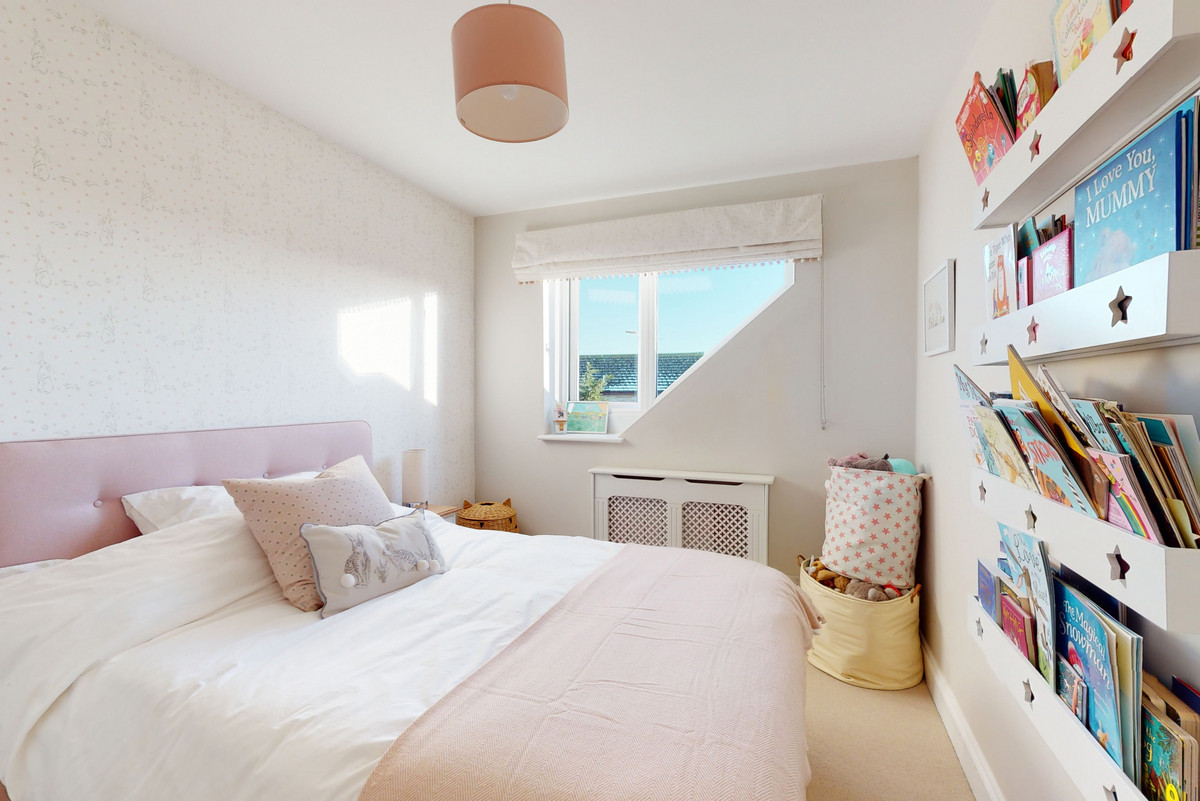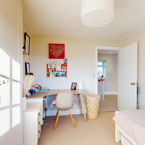Upstairs, a versatile office overlooks the rear garden, providing a perfect work-from-home space. The principal bedroom is a serene retreat with fitted wardrobes and a stylish en-suite shower room featuring a walk-in enclosure, twin basins, and a heated towel rail. Two further bedrooms—both doubles with fitted storage—share a contemporary family bathroom with bath and overhead shower.