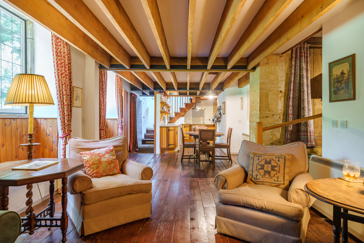 The property is approached via a picturesque path to a gravelled parking area, with the front door opening into a welcoming hallway. The open-plan kitchen, dining, and reception room is the heart of the home, furnished with antiques and rich in period character — oak floors, beams, window seats, and even a view of the original mill machinery through an internal window.