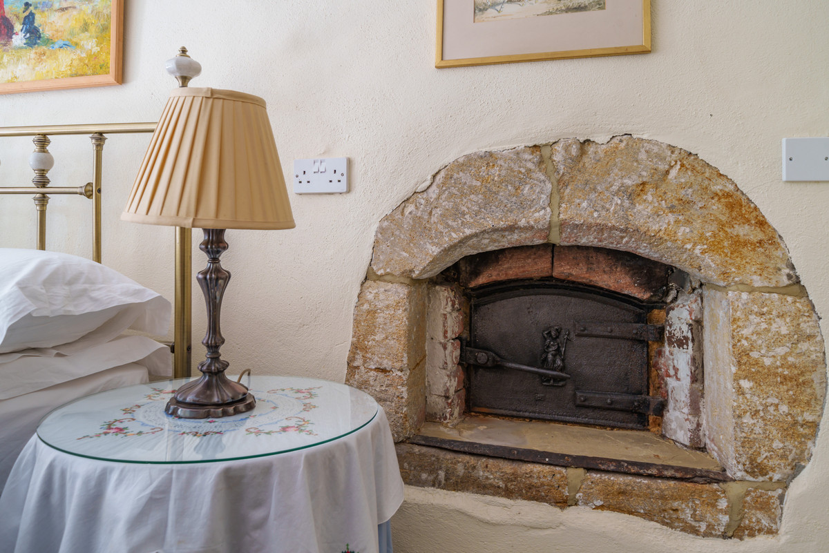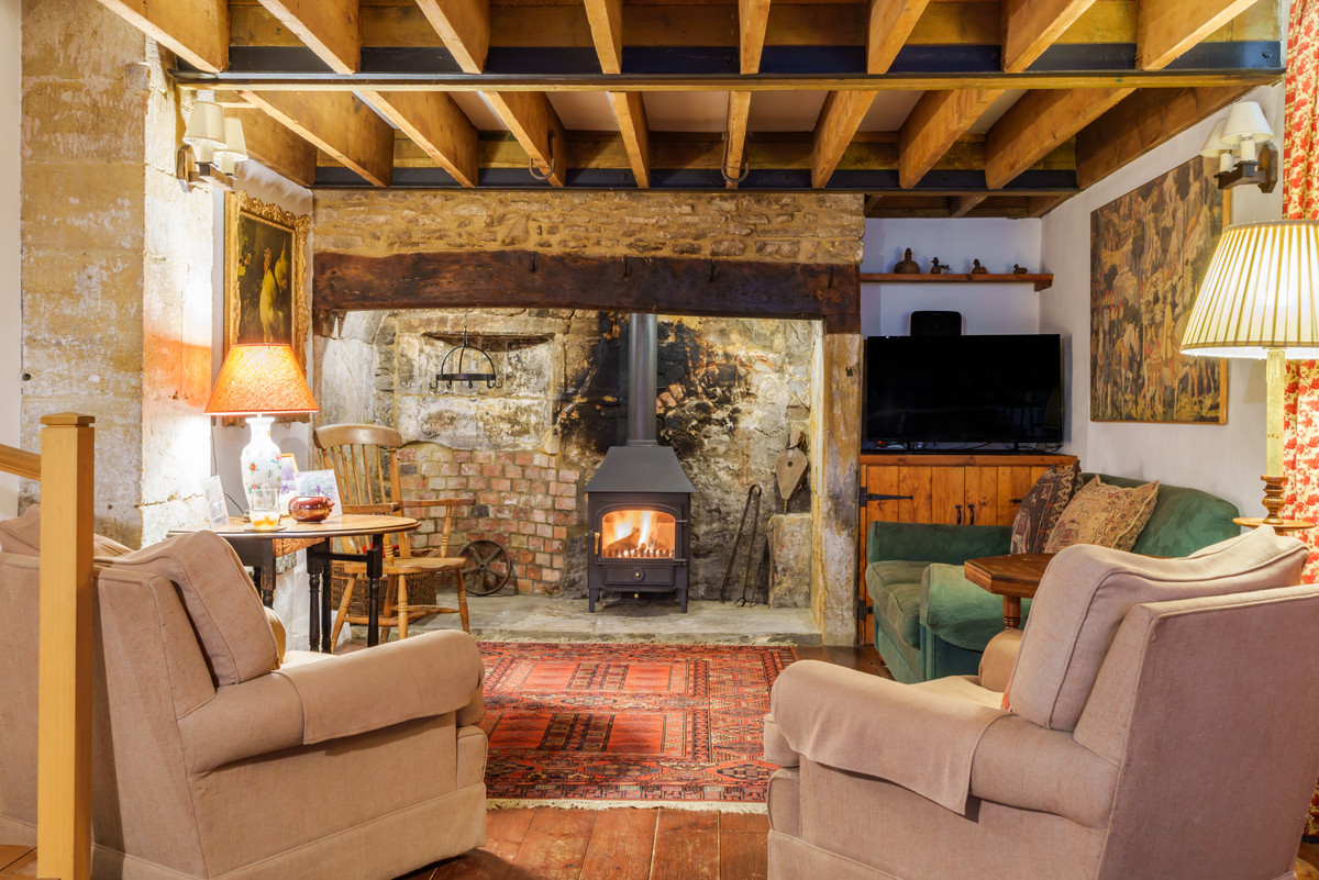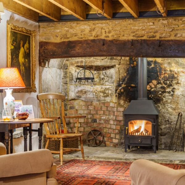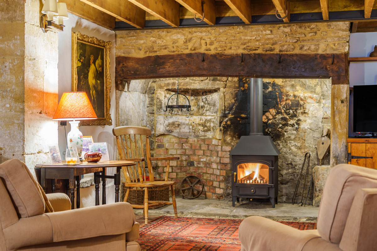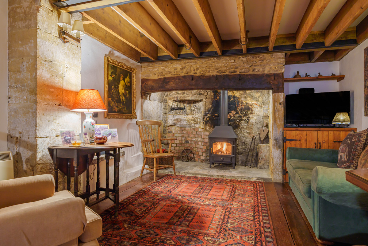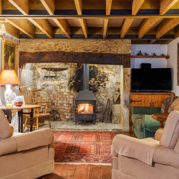 The kitchen is well-equipped with modern appliances, while the dining area comfortably seats six. The sitting room centres on an Inglenook fireplace with a wood-burning stove, creating a cosy and inviting atmosphere.