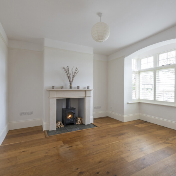 the principle rooms.The property is entered via a smart entrance opening into a bright hallway. The sitting room,located at the front of the house, features a striking stone fireplace with a log burner and a beautiful bay window overlooking the playing fields.At the heart of the home is the spacious 21.5 ft kitchen/dining room, which is both stylish and highly functional. Well-appointed with a gas Rangemaster, an integrated dishwasher, a full-length fridge-freezer, a Butler’s sink, and wooden work surfaces, it is designed for modern family living. A second log burner adds warmth and ambiance, making this space perfect for entertaining. The ground floor also features a guest cloakroom with a skylight and under floor heating as well as ample storage discreetly housing a tumble dryer and washing machine.