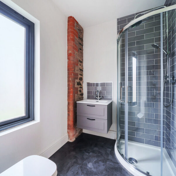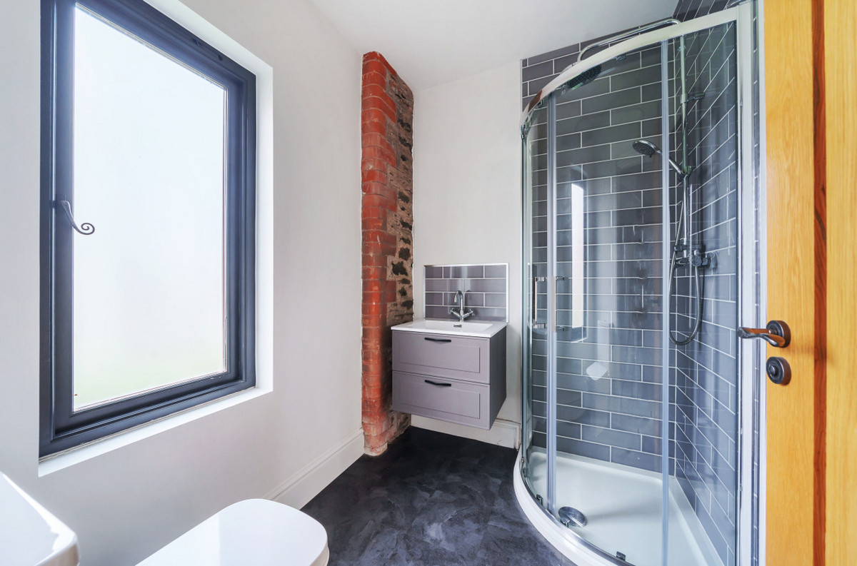 The shower room has a walk-in shower with a wall-mounted overhead shower, a hand-held shower attachment, a W.C., a wash basin with storage below, and a wall-mounted heated towel rail.
