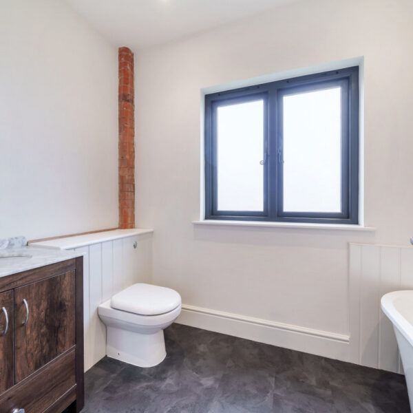 Next is the family bathroom with a roll-top bath with panelled surround, double-glazed, frosted windows, W.C. with concealed cistern, wash basin with Carrera marble top and storage below, and a wall-mounted heated towel rail.