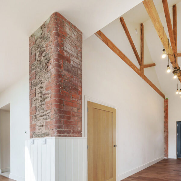 The front door opens into an eye-catching entrance hall with a vaulted ceiling, exposed timber beams, and contemporary lighting.