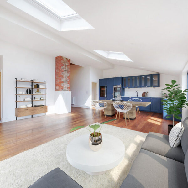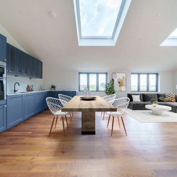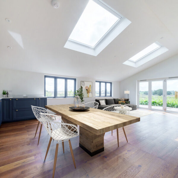 The whole house then opens up into the open-plan kitchen dining. This room has a smoked oak floor with underfloor heating, and natural light fills the space from two large Velux windows on the roof, two sets of double-glazed windows on one side, and timber bifold doors out to the garden on the other.